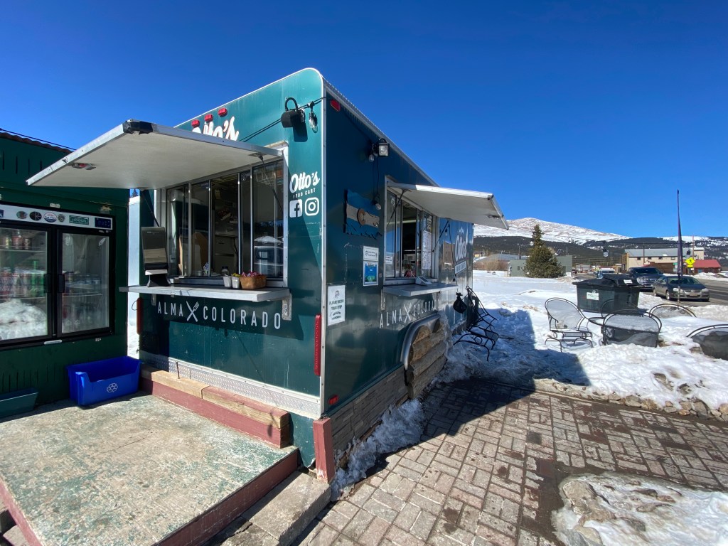 Otto’s Food Cart…..where it all started! The food cart is located on the south side of Hwy 9 in ‘downtown’ Alma, across the street from High Country Healing dispensary. Durning the summer you can catch Kiki’s Peaks Produce and The Good Side treat cart right on the same property.